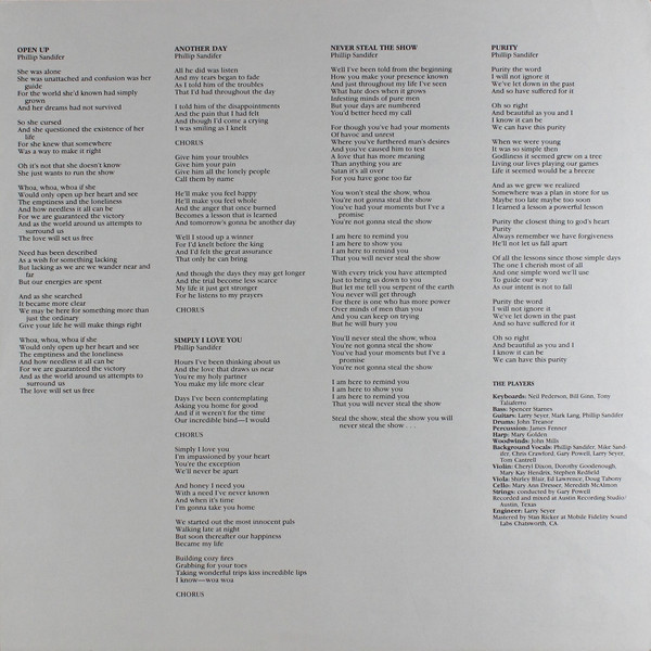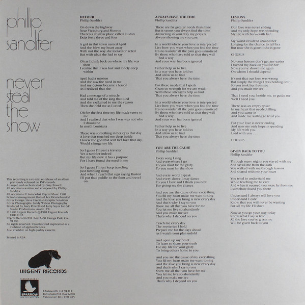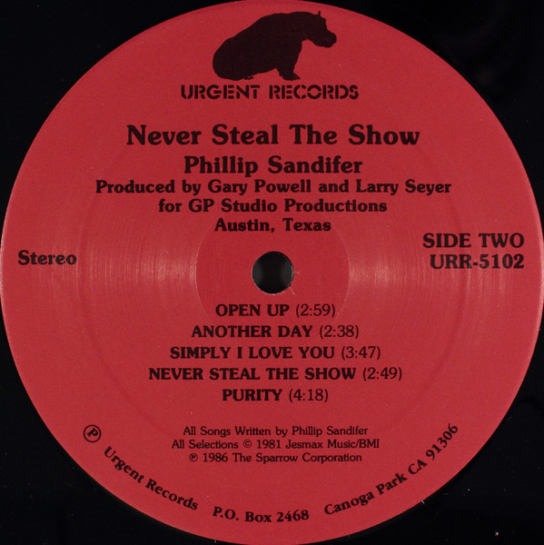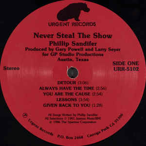 Phillip Sandifer wrote and recorded this album while a student at University Of Texas at Austin. It was recorded on a very tight budget and Phil retained the rights to the album. Retaining the rights to his music is something Phil was well known for and was due in part to his relationship with his godfather, Dallas lawyer Shannon Jones who helped bring the Buddy Holly bill. This effort to retain rights doesn’t appear to have hurt his career as he was very successful. This album was self released but some sort of deal was cut with Urgent records for it to be released on their label. This is a great easy listening album and was very popular for very good reason.