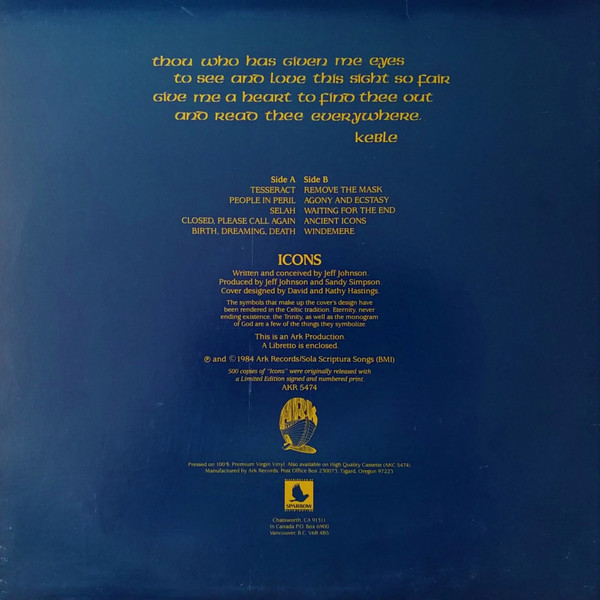 Jeff Johnson was making “New Age” music before “New Age” was cool. In fact, he was making it before it existed at all. More progressive rock than many of his new age instrumental contemporaries Jeff Johnson has, over the years, created a monstrous library catalog of utterly brilliant, passionate and spiritually moving music that has unfortunately escaped the attention of many in the CCM world. When “New Age” instrumental music was all the rage in CCM during the mid-1980’s Johnson was a leading artist, but many missed out on his more creative, provocative and, dare I say, commercial vocal projects. Of those many overlooked albums comes “Icons,” an utterly brilliant, and completely unforgettable album that is a must own for any audiophile. Not quite as commercial or rock influenced as “Fallen Splendor,” Icons contains some of Johnson’s best vocal music and remains his most cohesive vocal driven project. It also contains “Closed, Please Call Again,” which is Johnson’s finest song. Opening with “Tesseract,” an instrumental opener inspired by the concept of space travel as described in Madeleine L’Engle’s classic novel, “A Wrinkle In Time.” The book may be the only time in this blog I ever use the term “BYSO!” Johnson’s musically explores the “feeling” expressed in the book as the main characters travel through space using the tesseract. The album includes more of Johnson’s early progressive rock influences than on any album that follow outside of Fallen Splendor. “People in Peril” starts with limited percussive sounds and accompanying synthesizer background that is added upon as the song grows. Johnson’s wonderful falsetto is offset by a distant backing vocal that seems to challenge or respond to the lead the vocal as the song fades. The previously mentioned “Closed, Please Call Again” musically explores the heart of one postponing a response to the call of the Gospel or closed off to any true human contact. The song features some of the finest saxophone work on any Christian album. The longing heart is musically portrayed through the instrumental work and the aching vocals make this song a sheer delight. The saxophone is introduced brilliantly with a vocal and instrument interplay. There is so much more to be said about this amazing album, but space limitations prohibit a deeper discussion. Suffice it to say this is clearly an AYSO and would serve as a great introduction to the artist for those unfamiliar with his amazing collection of work.