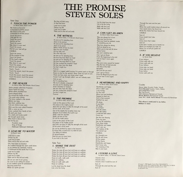 Credits Acoustic Guitar, Vocals – Steven Soles Backing Vocals – Jude Johnstone, Wendy Matthews Bass Guitar – Jerry Scheff Drums – Ron Tutt Guitar, Violin, Dobro – David Mansfield Percussion, Handclaps – Geoffrey Hales, Jude Johnstone, Larry Hirsch, Ray Vaughn, Wendy Matthews Photography By – Ray Vaughn Producer – Steven Soles Recorded By, Engineer, Mixed By – Larry Hirsch
