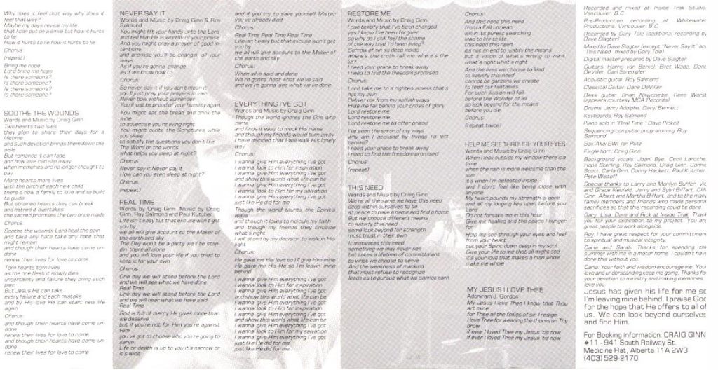 Credits Acoustic Guitar, Programmed By, Keyboards, Sequenced By, Backing Vocals, Producer – Roy Salmond Backing Vocals – Carla Ginn, Cecile Laroche, Connie Scott, Donny Hackett, Hope Sterling, Joani Bye, Paul Kutcher, Pete Wistoff Bass Guitar – Brian Newcombe, Rene Worst Drums – Daryl Bennett, Jerry Adolphe Flugelhorn, Lead Vocals – Craig Ginn Guitar – Brett Wade, Carl Strempler, Harris Van Berkel Guitar, Classical Guitar – Dane DeViller Piano – Dave Pickell Recorded By, Mixed By – Gary Tole Recorded By, Mixed By, Mastered By – Dave Slagter Saxophone – Ian Putz