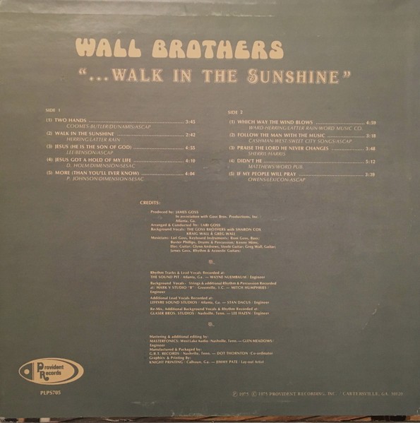 This is the first album from The Wall Brothers. It was initially self released as a self titled album but it looks like Greentree Records picked it up the following year and released it with a new cover and title. I still can find anything out about these guys. I have discovered that before this album they were known as The Chancellors and had a couple albums with the Lefevre family. I can’t find either of those two albums but they look like they were more praise oriented. As for the album I really liked the opening track but it should never have been chosen as an opening track. The rest of the album is a little dull but if you like 70’s Jesus music you might like it. When I say dull I mean, typical. It is a typical 70’s light rock Jesus music album but not a bad one.