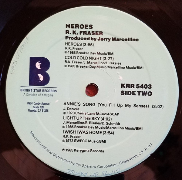 I can not find very much information about R.K. Fraser. I do know this was his only Christian album though he did have 2 albums in the 70’s that I have not listened to yet. The album was on Bright Star Records which was a division of Kerygma Records, Kerry Livgren’s label. The album was also associated with the American Coalition of Traditional Values (ACTV). Fraser was a Vietnam vet serving in 1969 and 1970. This fact helps explain the rather odd album cover which makes sense once you realize he was wearing face camouflage as was done in Vietnam. The album contains a pretty good cover of John Denver’s Annie’s Song. The album is a pretty easy listening pop album that was probably more oriented at our parents than us. Anyway it’s a pretty good album and while little known those who did have it seem to have great memories of it.