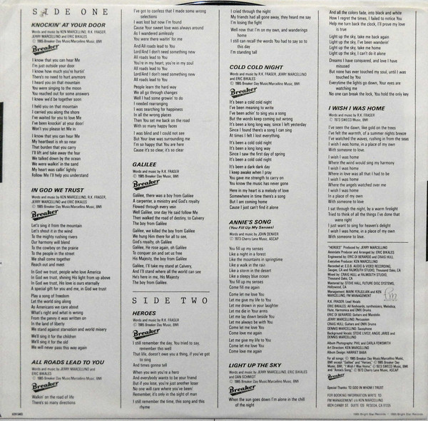 Tracklist 1 – Knockin’ At Your Door 2 – In God We Trust 3 – All Roads Lead To You 4 – Galilee 5 – Heroes 6 – Cold Cold Night 7 – Annie’s Song 8 – Light Up The Sky 9 – I Wish I Was Home